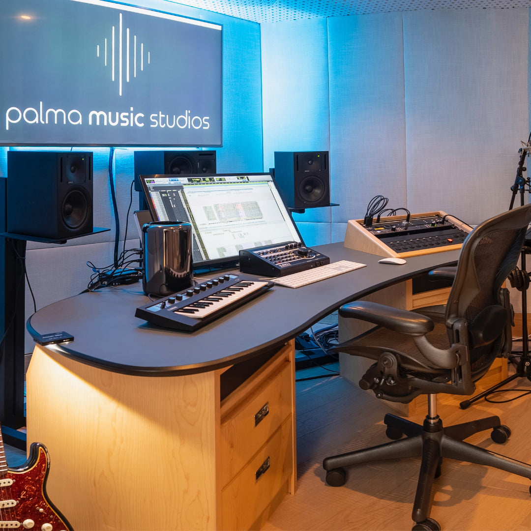 It features Genelec 1031a monitors, Universal Audio Apollo x8 interface, Neumann TKLM 107 microphone and a Roland RD2000 keyboard.